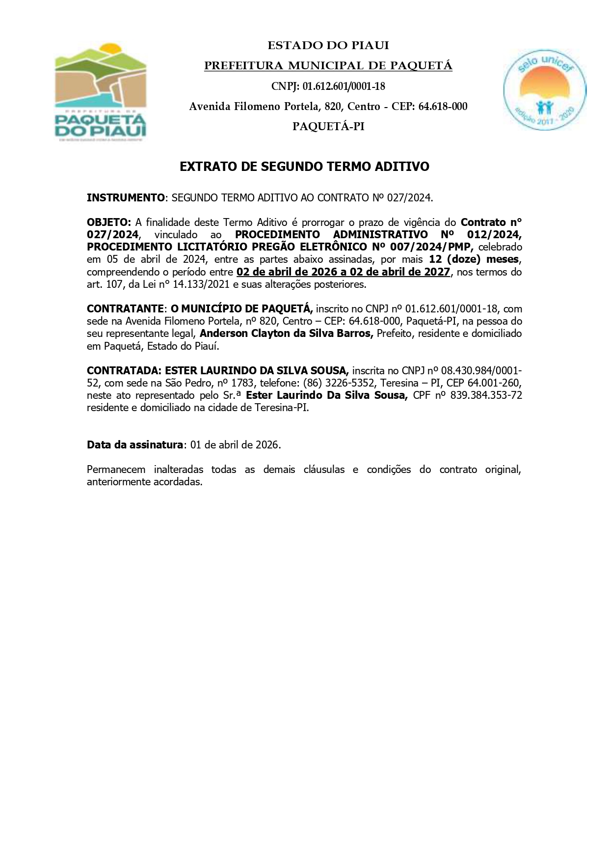 EXTRATO 2° TERMO ADITIVO AO CONTRATO 027-2024